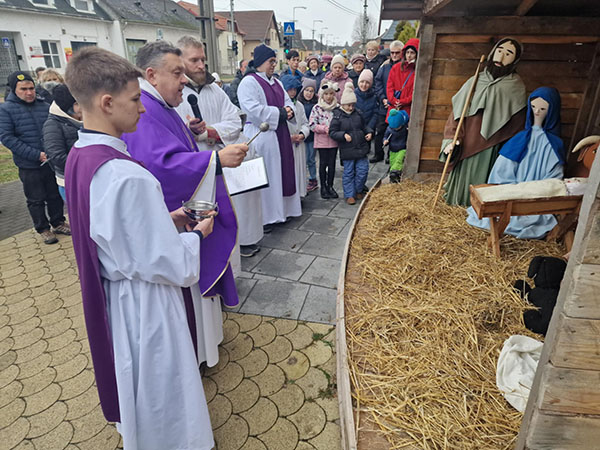 Kazincbarcikán, a Sportcsarnoknál állítottunk fel egy ilyen betlehemet, és nagyon jó volt látni, hogy karácsony előtti napokban összegyűlt ott egy-egy család néha, vagy csak mentek a gyerekek át a McDonaldsba, vagy mentek a gyerekek át a suliba, vagy az óvodába anyuval, nagymamával, megálltak egy picit. Ferenc pápa is erre hív meg bennünket, hogy legyenek olyan helyek, ahol megállunk. Milyen jó, amikor az útmenti kereszt előtt keresztet vettünk, hogy észrevesszük, hogy Isten velünk van mindig, mindenhol. Kellenek nekünk ezek a jelek, szimbólumok, eszközök, alkalmatosságok, amelyek Isten jelenlétére és szeretetére hívnak meg bennünket, figyelmeztetnek minket.