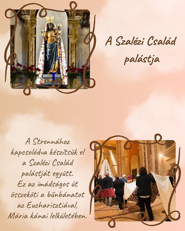 A palást belső darabjai ebben az időszakban gyűlnek össze. A közösségekben és a Szalézi Családban lehetőség nyílik arra, hogy mindenki egy-egy textildarabot ajánljon fel, imádságos csendben, a bűnbánat és az elengedés lelkületében. Ez a gesztus azt fejezi ki: van, amit le kell tennünk, van, amit rábízunk az Úr irgalmára.