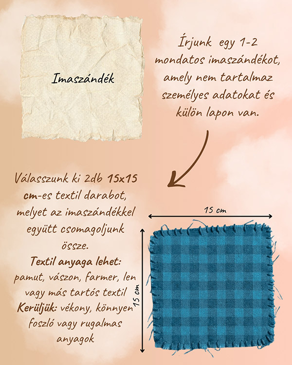 - Az imaszándékot külön papíron kérjük megfogalmazni, nem a textilre írva.