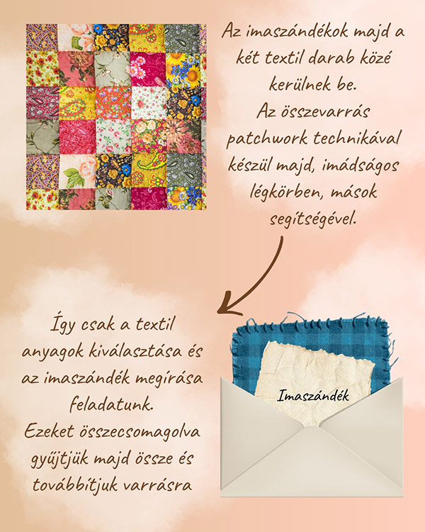 - A palást patchwork technikával készül, a felajánlott textildarabokból, a közéjük illesztett imaszándékokkal.