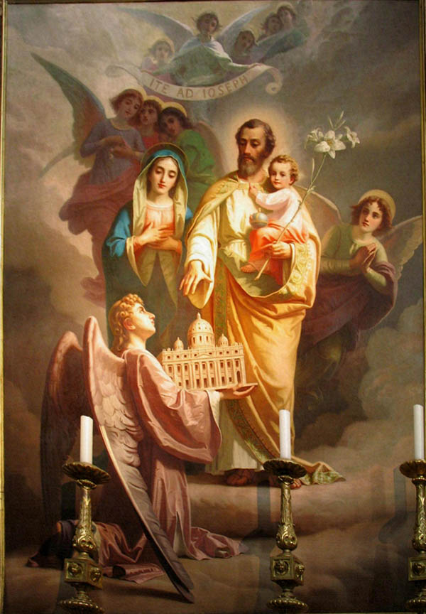 A Giuseppe Rollini által festett római festményen Szent Józsefnek, az Egyház védelmezőjének funkcióját mutatja be, úgy jelenítve meg őt, amint őrzi a Szent Péter-bazilikát, amelyet egy térdelő angyal nyújt neki. Mindkét vásznon felülről kerubok veszik körül, akik egy föliratot tartanak, amelyen a nézőknek szóló üzenet olvasható: „Ite ad Joseph ”, „Menjetek Józsefhez!”