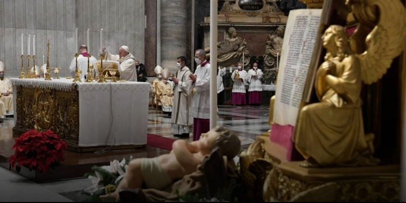 Az ünnepi fényben úszó Szent Péter bazilika katedra oltáránál kezdődött december 24-én este fél nyolckor a karácsonyi éjjeli szentmise, a koncelebráló kuriális bíborosok és püspöpök, valamint 150 hívő jelenlétében. Ferenc pápa a szentmise kezdetén az oltár közelében felállított betlehemi jászolhoz ment, levette a leplet a kisded Jézusról, majd megcsókolta az istengyermek kicsi szobrát. Homíliájában Istennek erről a mindent felülmúló ajándékáról elmélkedett, melyet nekünk és értünk adott szeretetből.